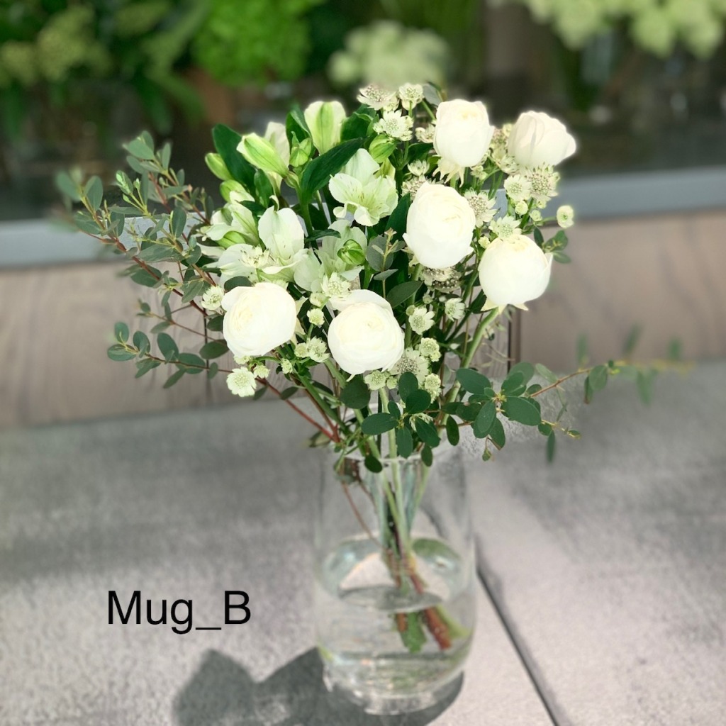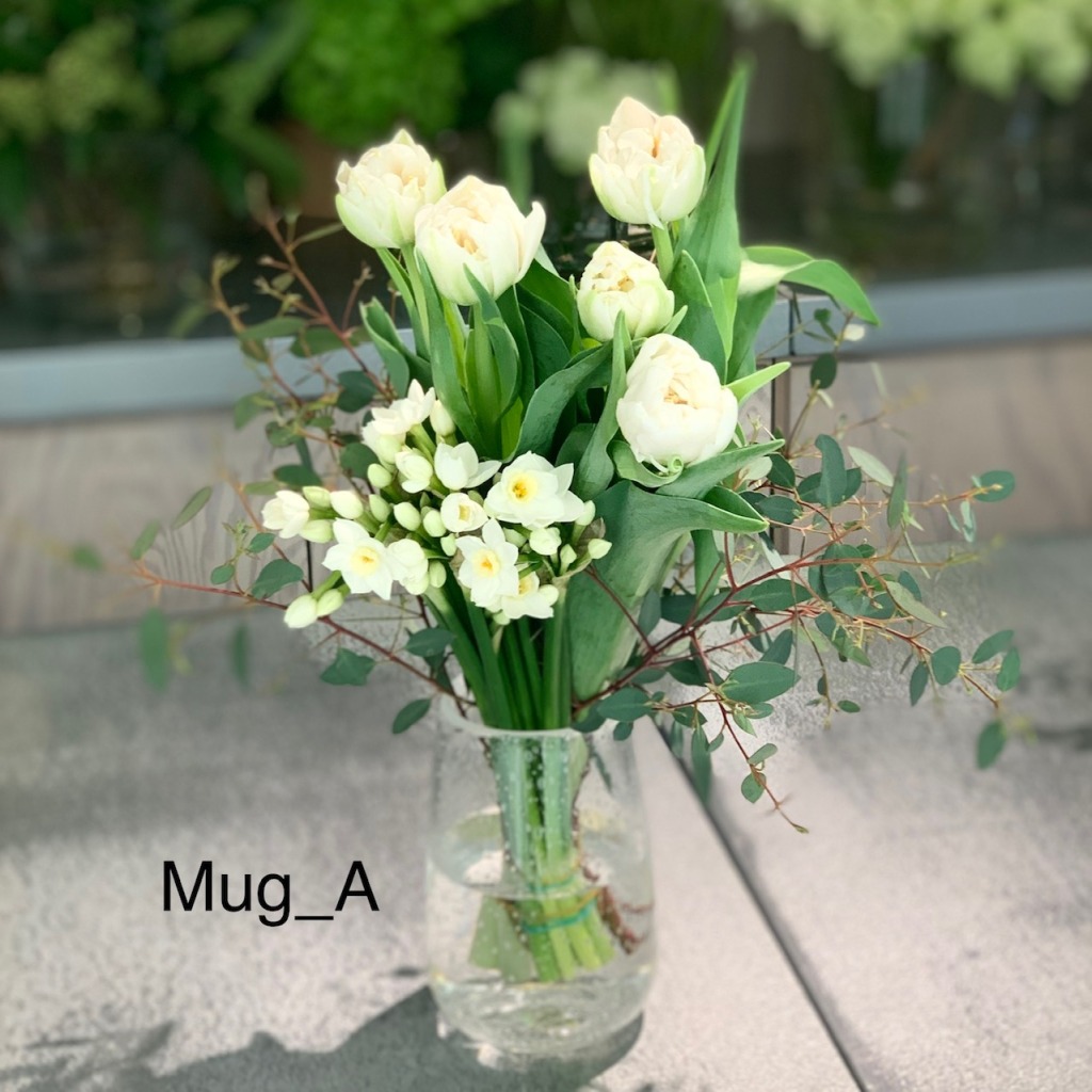 春を感じるマグブーケAです。八重咲きの丸いお花のチューリップと香りの良い猫水仙にグニーユーカリをあしらいました。猫水仙は一年に一度だけ入荷するお花で、普通の水仙はお花の中心が黄色ですが猫水栓はおしべ意外、純白です。10本入れているので数本抜いて一輪挿しに飾って下さい。