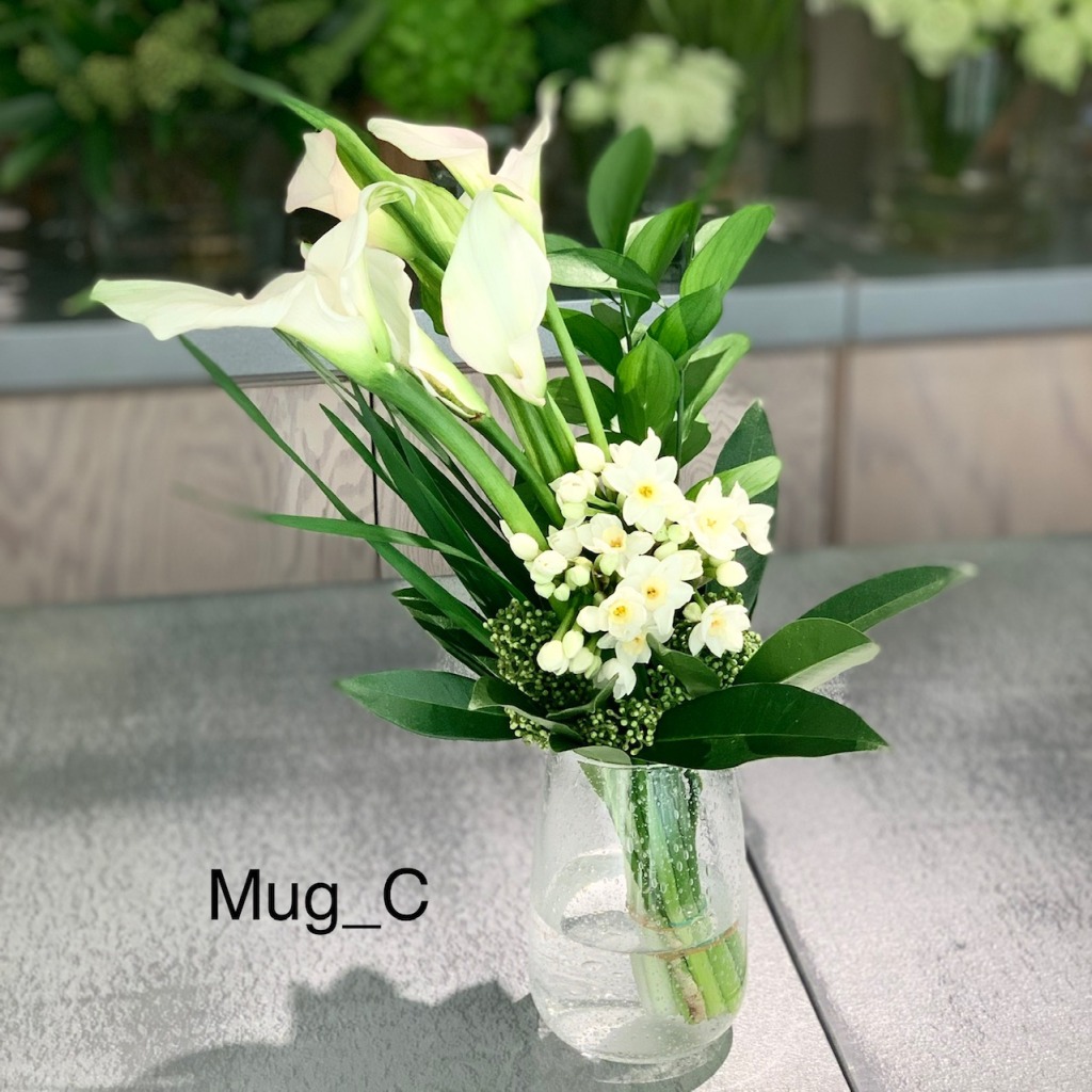 春を感じるマグブーケCです。この時期、抜群に長生きするカラーと香り良い猫水仙にスキミアとルスカスをあわせました。猫水仙は一年に一度だけ入荷するお花で、普通の水仙はお花の中心が黄色ですが猫水栓はおしべ意外、純白です。10本入れているので数本抜いて一輪挿しに飾って下さい。