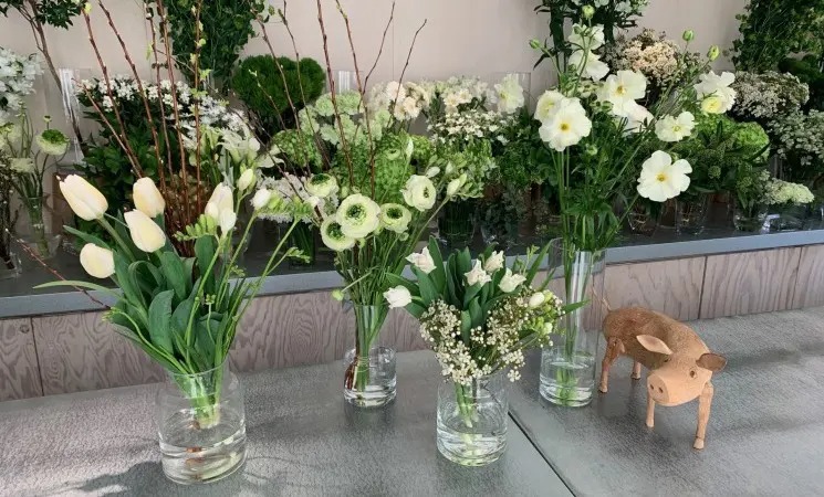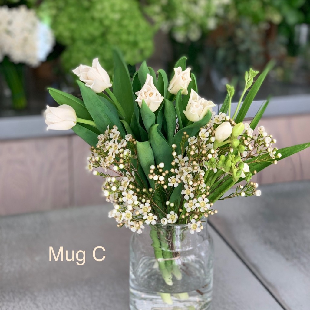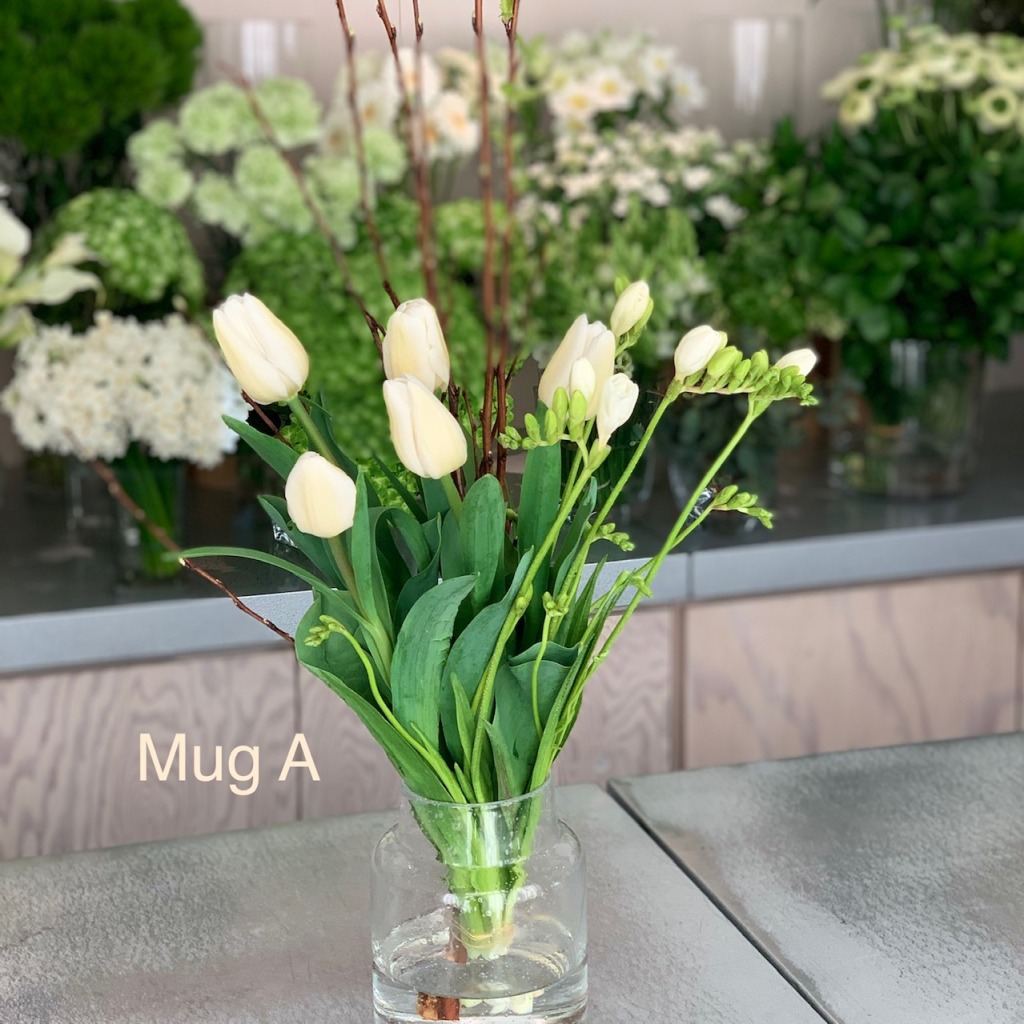 一般的なスタンダードの白いチューリップに春の代表的なフリージアを合わせ、新芽が可愛い黄金葉を合わせました。やっぱりチューリップは、お花の姿がキレイに見えるようにシンプルに飾るのが一番です。チューリップがぐんぐん伸びて生長する姿も可愛いです。意外と知らないチューリップについてはコチラご覧ください。