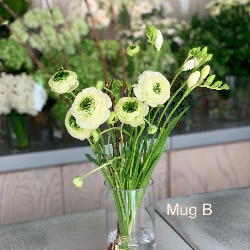 今年からJimmyにレギュラーに入りしたラナンキュラス、ホワイトベールに春の代表的なフリージアに新芽が可愛い黄金葉を合わせました。ホワイトヴェールはお花の中心がグリーンで不思議な感じですが開くとほんと綺麗です。八重咲きで大輪系のフリージアは香りがとてもよく長生きします。