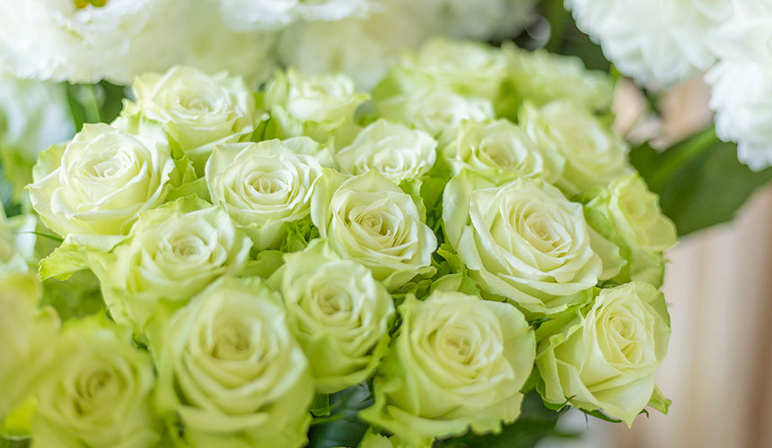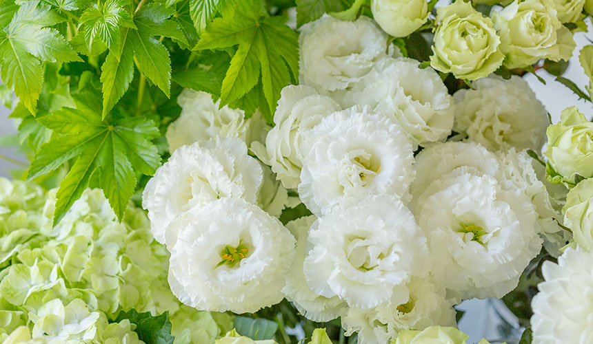 徹底的に最高品質の白いお花の産地・生産者を厳選し、責任をもって鮮度の良いお花を提供すると同時に、白いお花とグリーンが共鳴し合うコンビネーションを追求していきました。