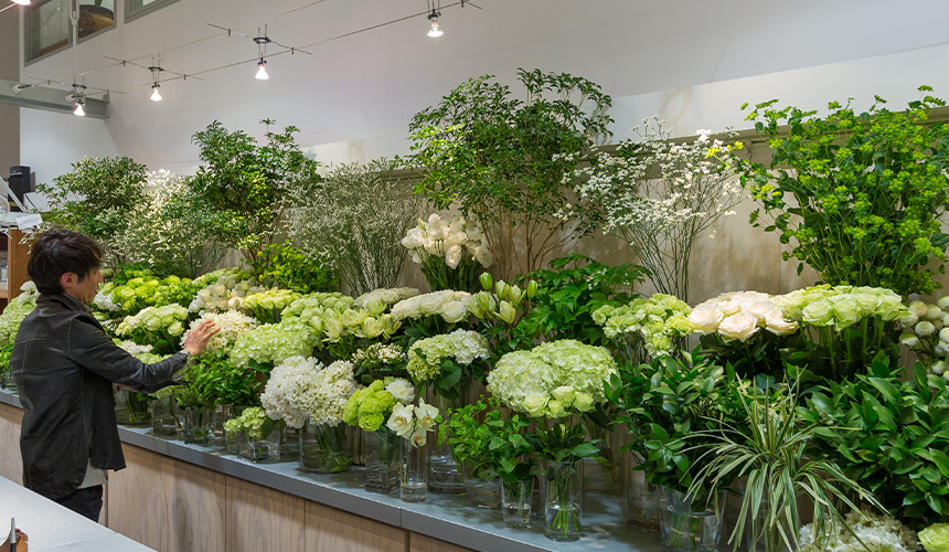 また、店頭では世界中から遠路はるばるお店にやってくるたくさんの白・グリーン系のお花たちに愛情を込め管理し、そのお花たちに命を吹き込むように美しく見えるディスプレイにもこだわっています。